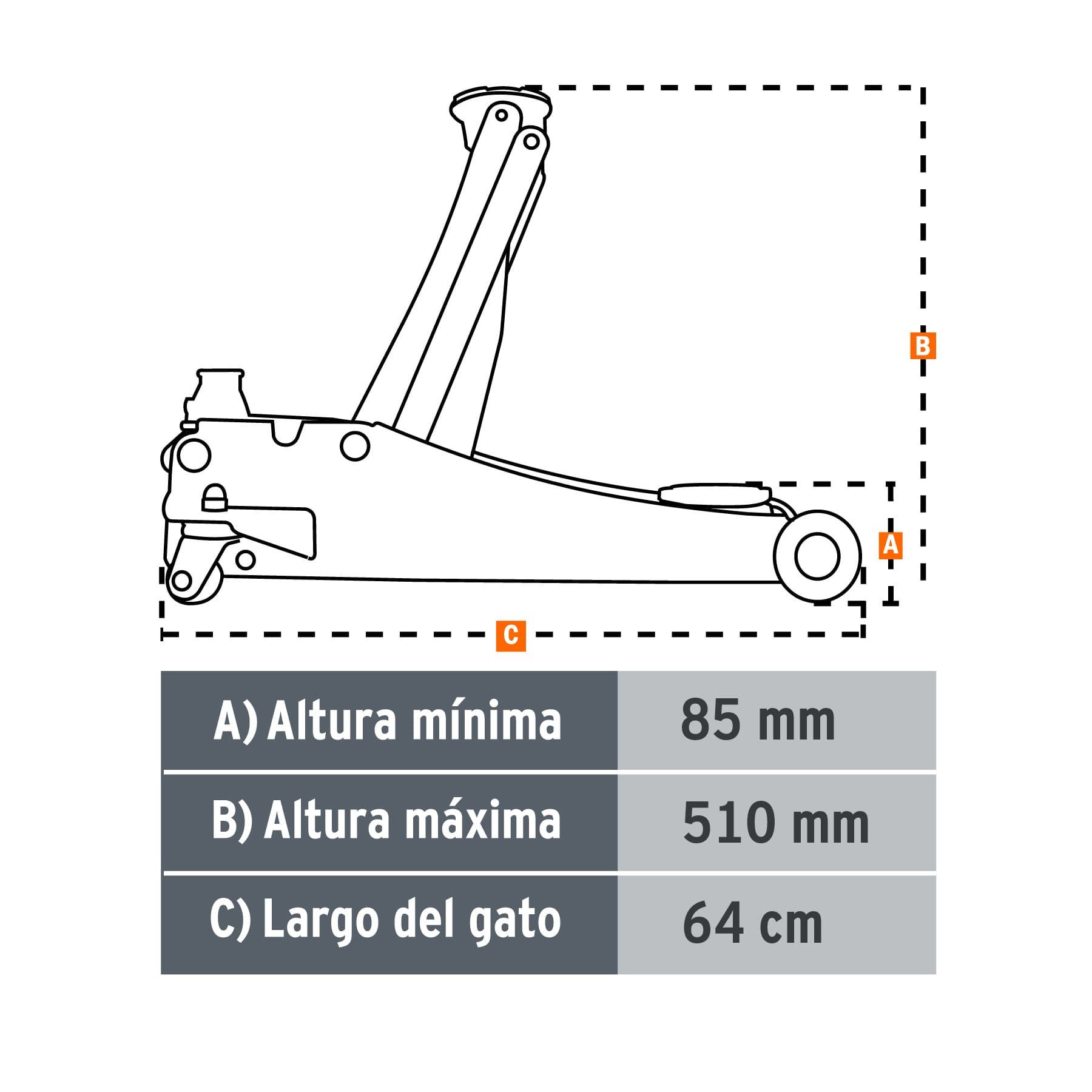 • Doble bomba que incrementa la fuerza y velocidad de levantamiento en 9 movimientos • Llantas traseras giratorias para fácil manejo • Válvula de seguridad que evita la sobrecarga • Para autos deportivos con perfil extra bajo • Maneral que controla el levantamiento y descenso